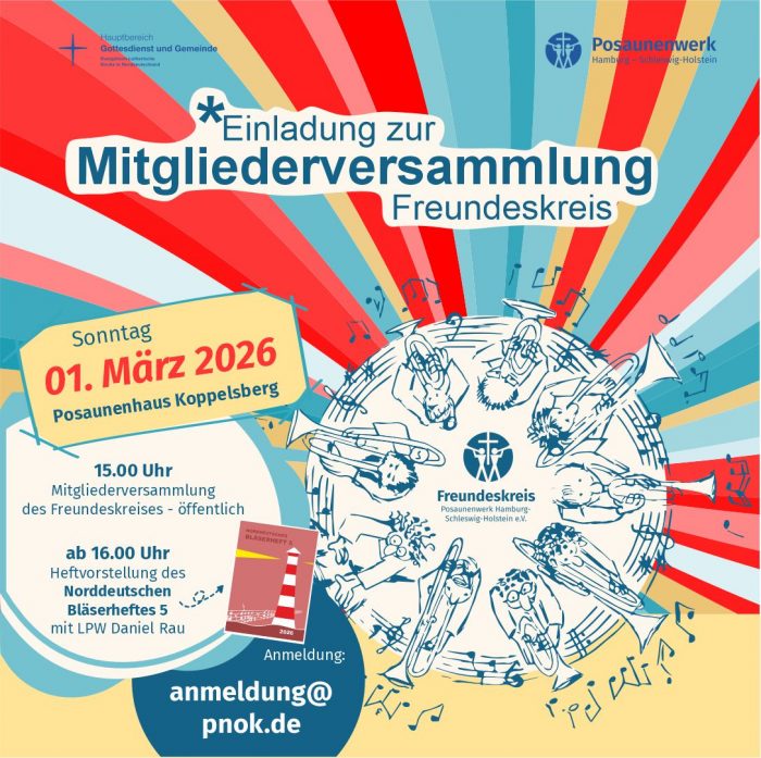 Mitgliederversammlung des Freundeskreises – 01. März 2026, Koppelsberg Der Freundeskreis des Posaunenwerks Hamburg–Schleswig-Holstein lädt herzlich...